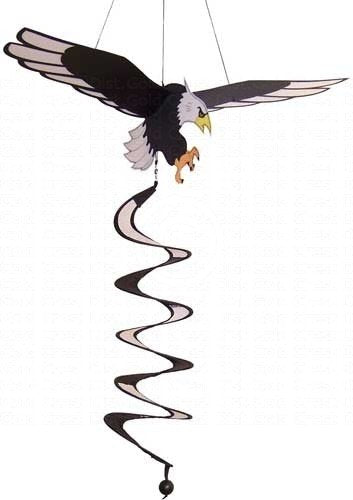 Eagle Twister Wind Spinner Eagle Twisters come with movable wings and a fun curly twister tail. They are 16 inch x 30 inch. Their bodies are made with weather resistant rip stop polyester. The dye sublimation process is used to give you detailed features. The fabric is laminated to plastic giving them a rigid form. A polyester curly tail is attached with a swivel and will give you endless turns. A snap swivel is used on top of the strings for hanging.