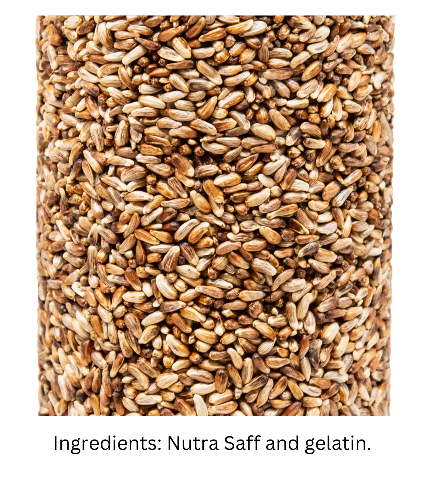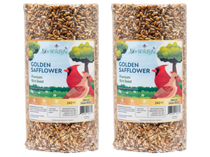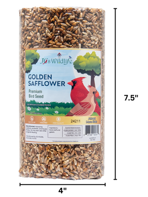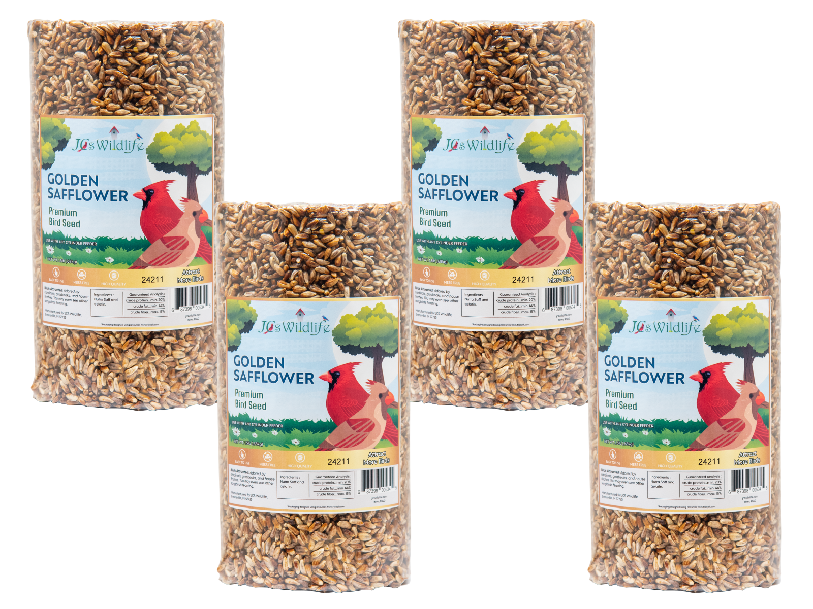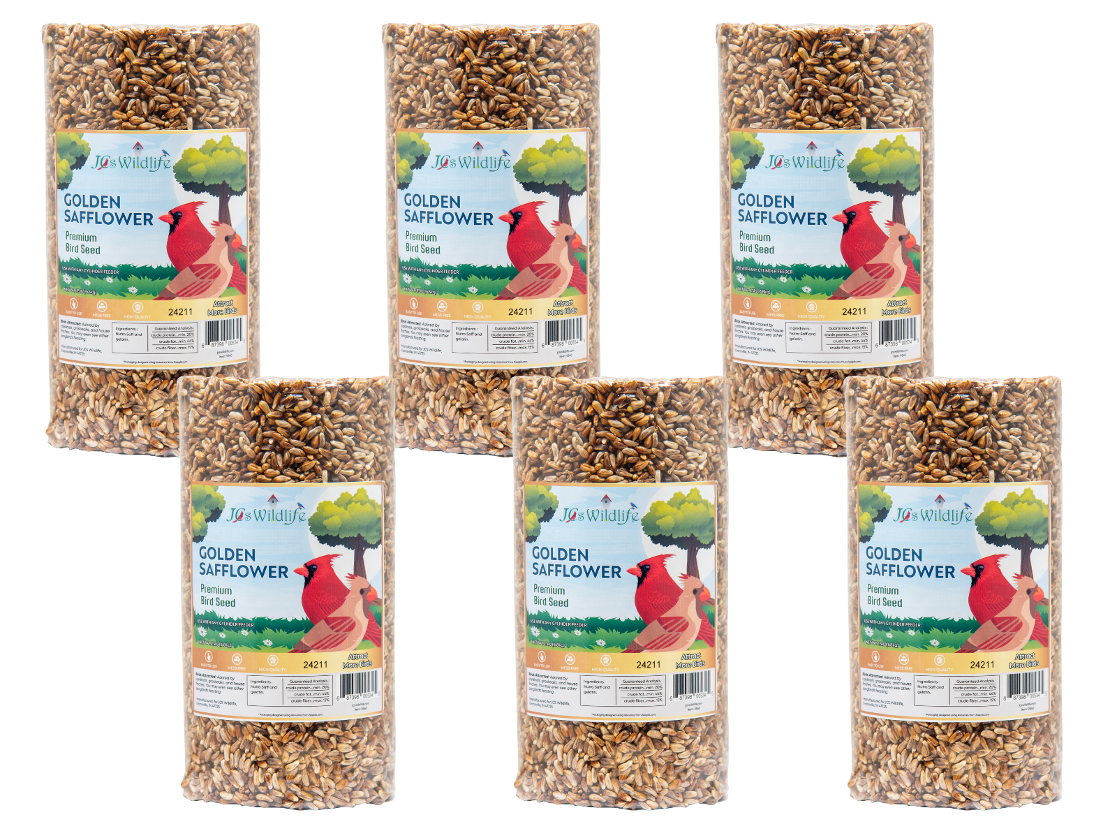 Golden Safflower, also known as Nutra Saff, is a safflower hybrid specifically developed for bird feeding to have a thinner hull (40% thinner) and higher levels of oil (15% more), protein (25% more), and fat (30% more) than traditional white safflower. It's easier and healthier for your birds to eat, and studies show that birds prefer it 2 to 1 over traditional safflower! It also tends to deter squirrels, grackles, and starlings with its bitter taste, although some individuals may adapt and eat it with time or in desperation.