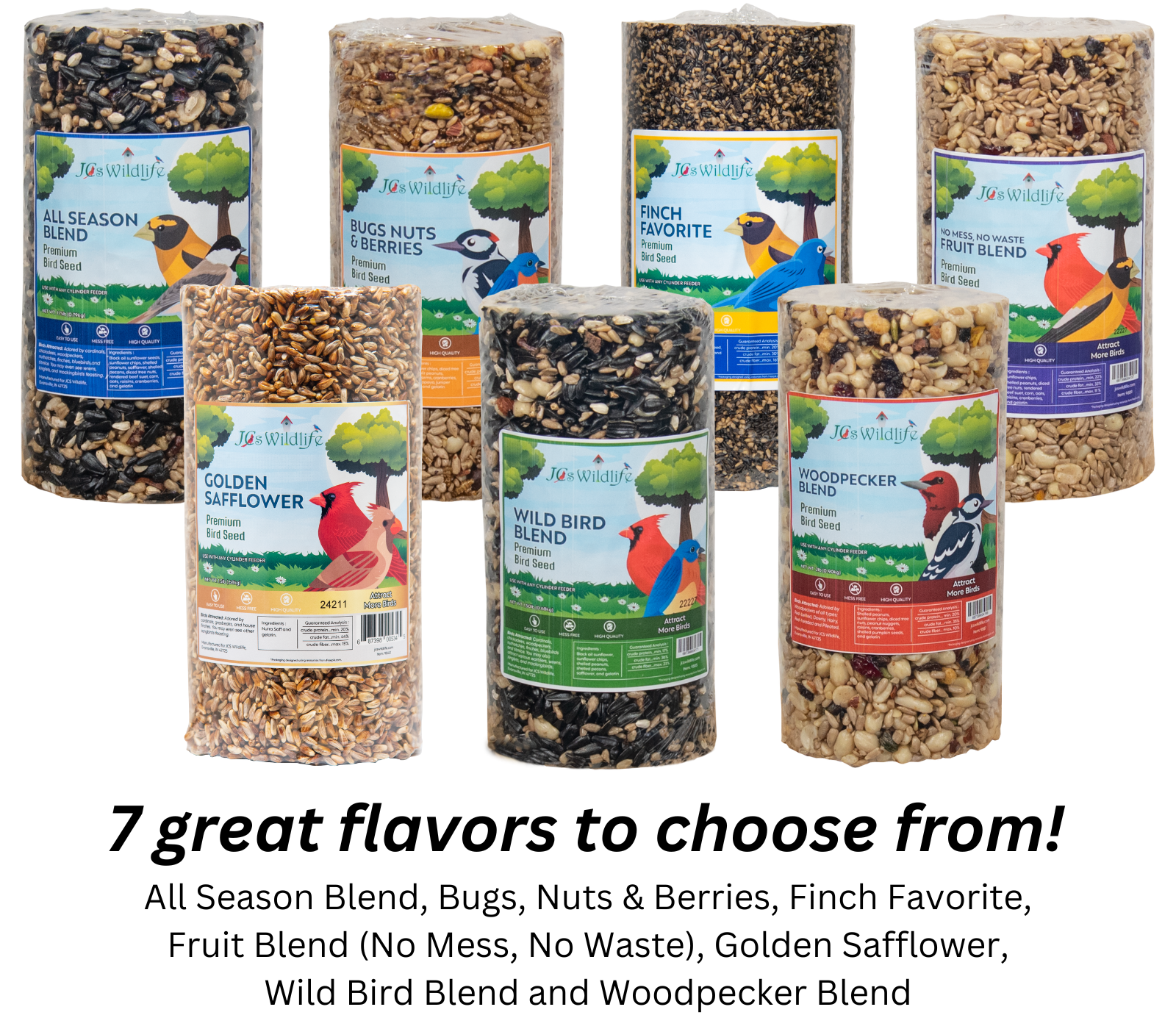 Attracts: Cardinals, Jays, Chickadees, Nuthatches, Grosbeaks, Titmice, Doves, Finches (House, Purple), Downy Woodpeckers, and Chipmunks; occasionally House Sparrows