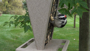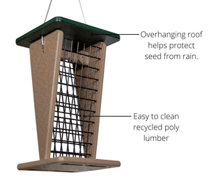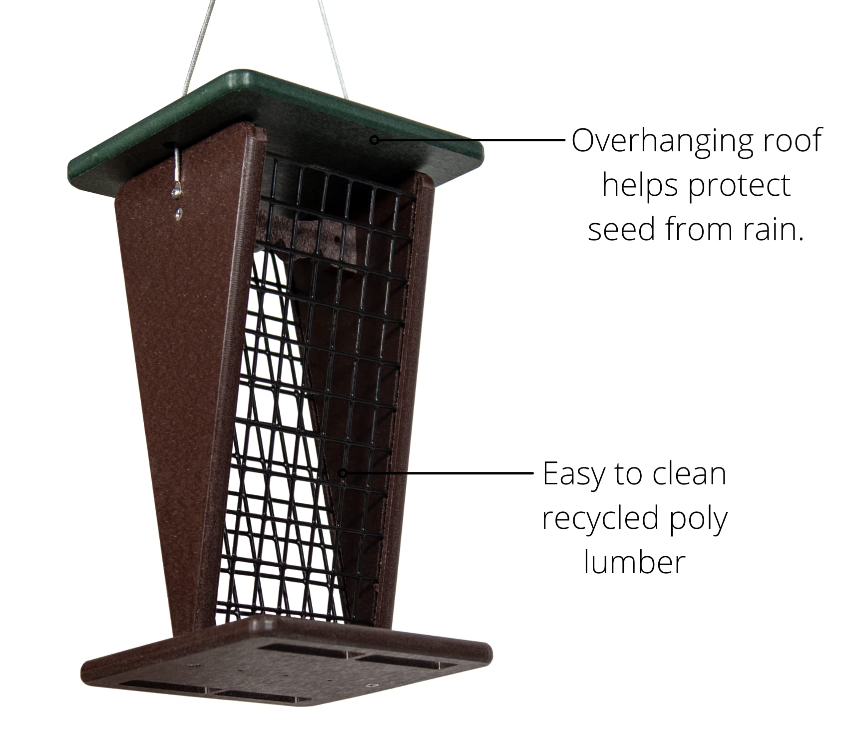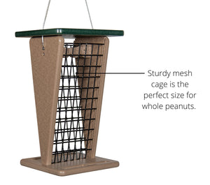 These original whole-in-shell peanuts feeders are designed to last a lifetime. Their resilient construction and poly lumber materials ensure that this feeder will be a part of your outdoor decor for years to come. Its metal grate provides a great way for birds to hold on and access the whole-in-shell peanuts. Keep your songbird friends happy when you provide them with plenty of delicious whole-in-shell peanuts. And to top it all of, these are handmade in the USA! Dimensions are 7.5"W x 12.5"H x 7"D