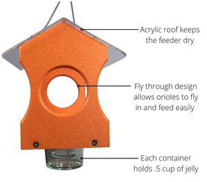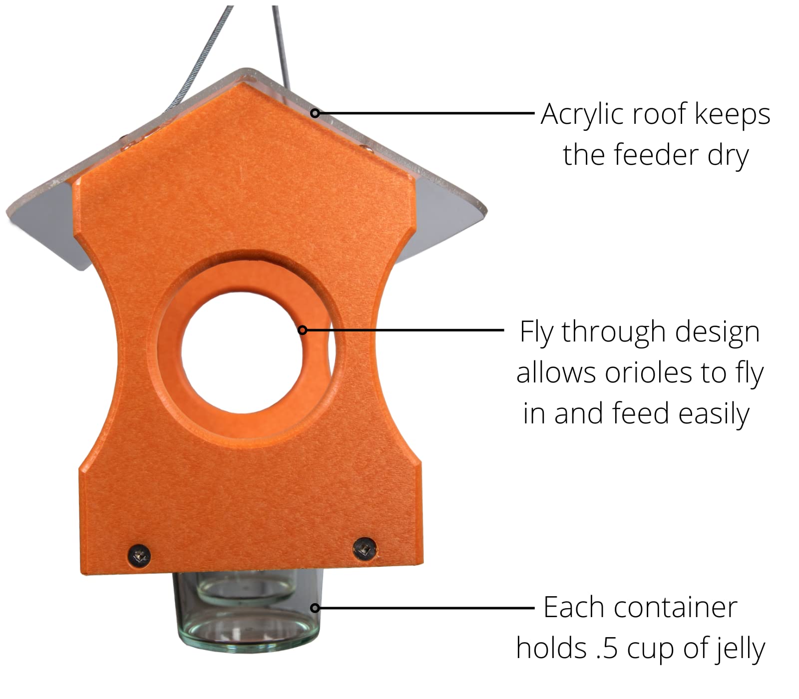 Poly Lumber Orange Oriole Bird Feeder 3000 is a wonderful way to attract orioles to your garden. Made of durable poly lumber and 1/8" plexiglass with stainless steel screws, and 2 included plastic jelly jars, this hanging oriole feeder is built to last. With an appealing vibrant orange color and an attached hanging cable, this oriole feeder is ready to be filled by your oriole jelly of choice. This Nature Products USA feeder is a great place for orioles to perch and enjoy their jelly treat! A fun vibrant color that stands out! Proudly handmade in our production shop in southern Indiana.