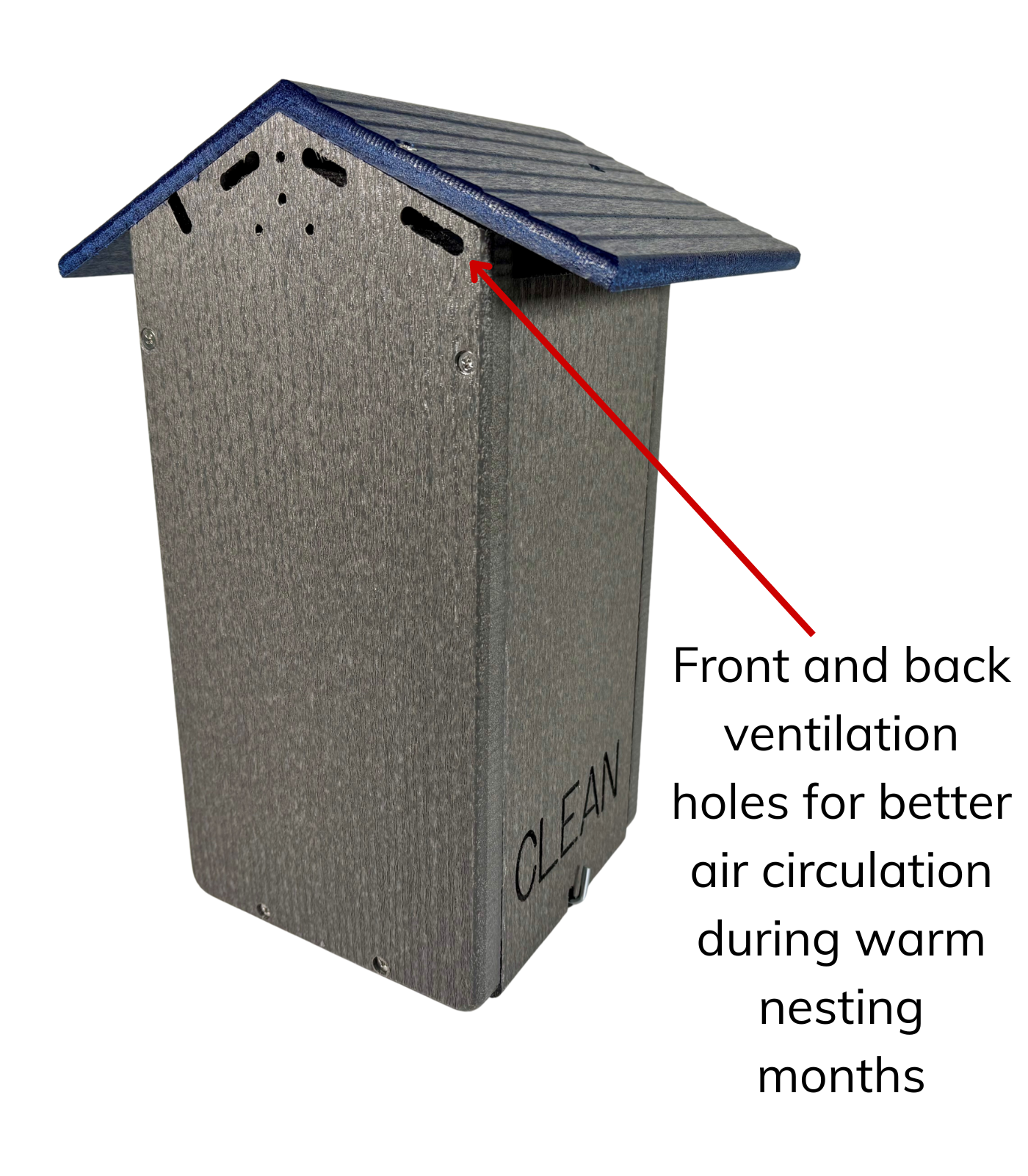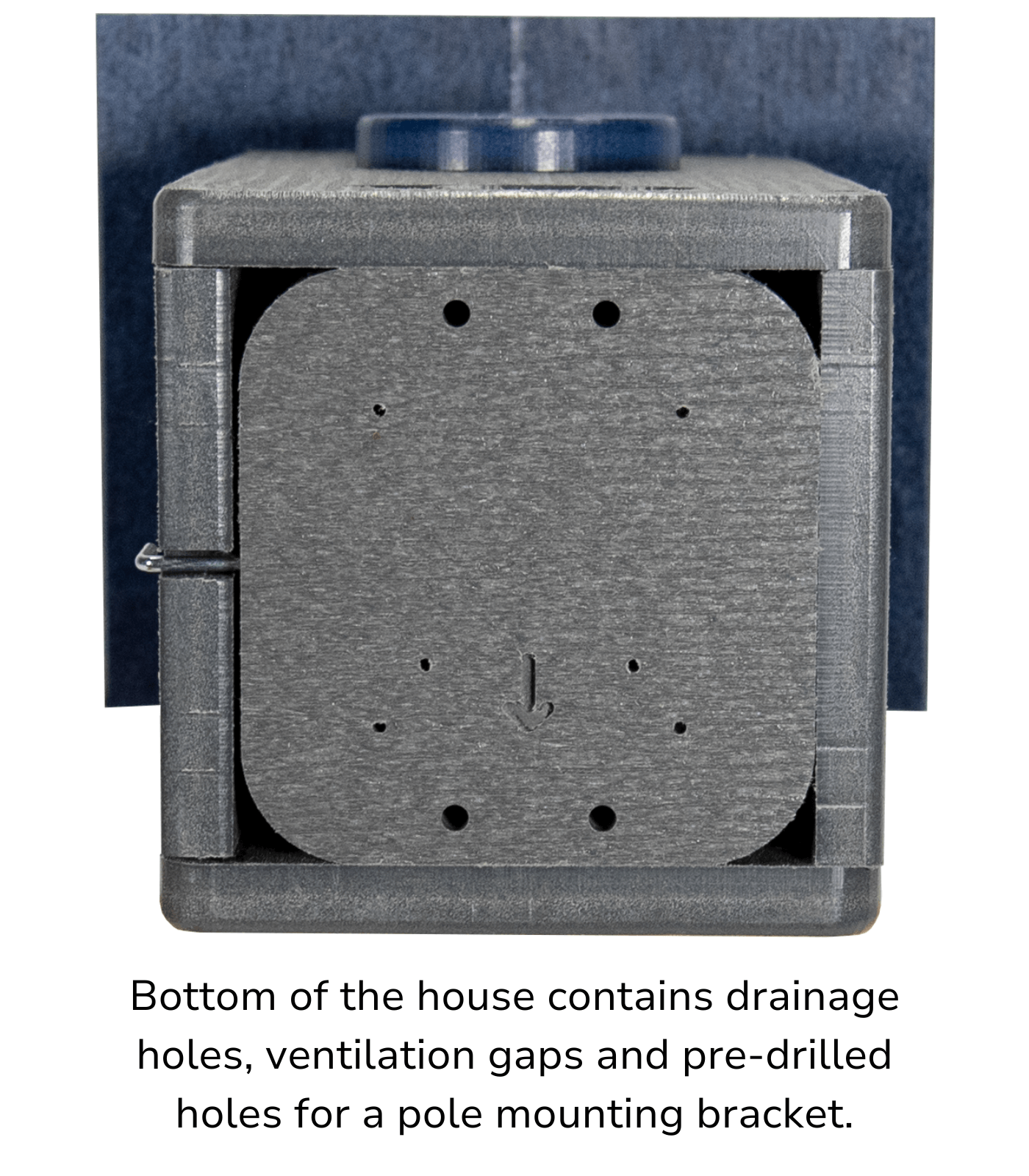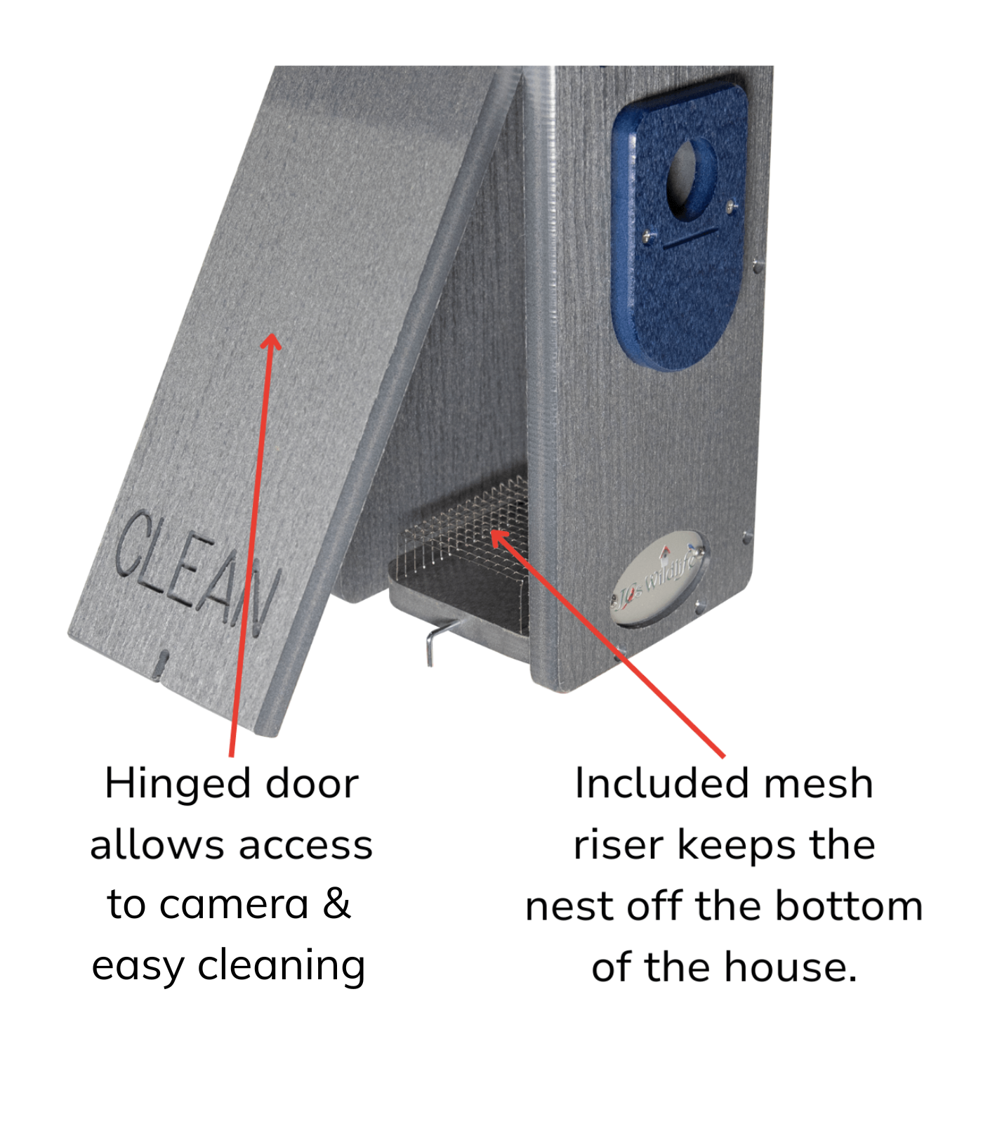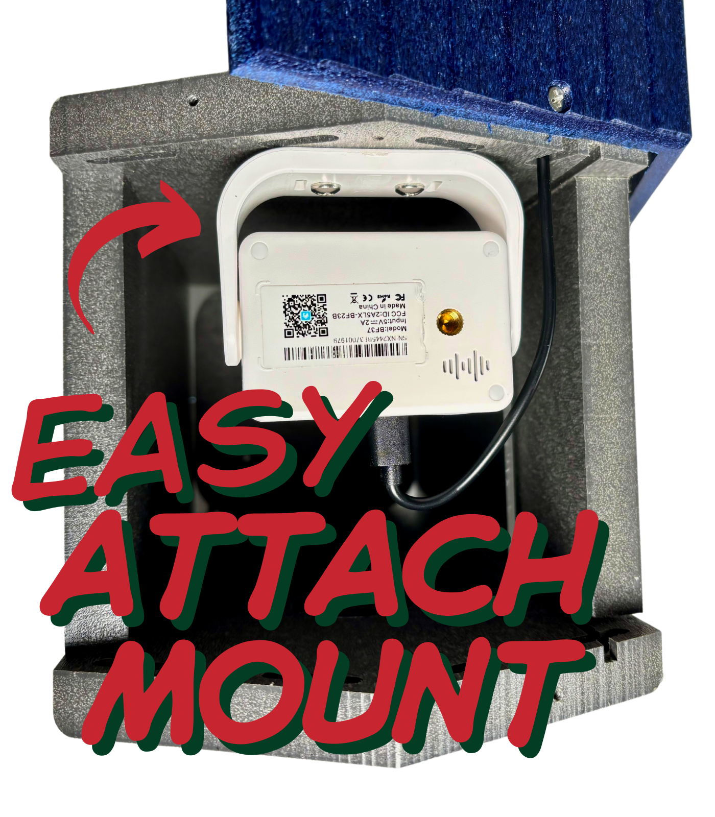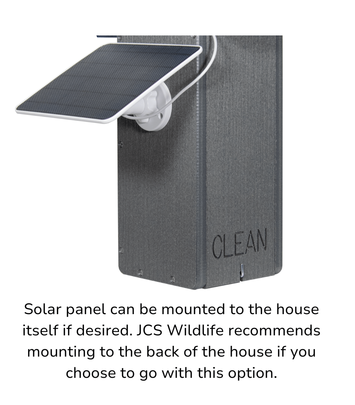 The newest addition to our Smart Camera Series - the JCS Wildlife Smart Ultimate Bluebird House. The Smart Ultimate Bluebird House is an upgrade to our existing tried and true Ultimate Bluebird Nesting Box. An upgraded 3 MP Wi-Fi camera is housed under the roof, giving you a literal birds-eye view of activities within the house. As with the EZ-Fill Smart Hopper, the camera in this nesting box links to your smart device via the Bird Lover app and is charged using the same detachable solar panel. This beautiful hand-made Ultimate Bluebird House is made by JCS Wildlife with Recycled Poly Lumber. It features all screwed construction using stainless steel screws and routed edges. This house will not crack, split or fade - it will look great for years to come. The colors are vibrant and UV protected. The poly lumber is also stain proof and easier to clean than regular wood.