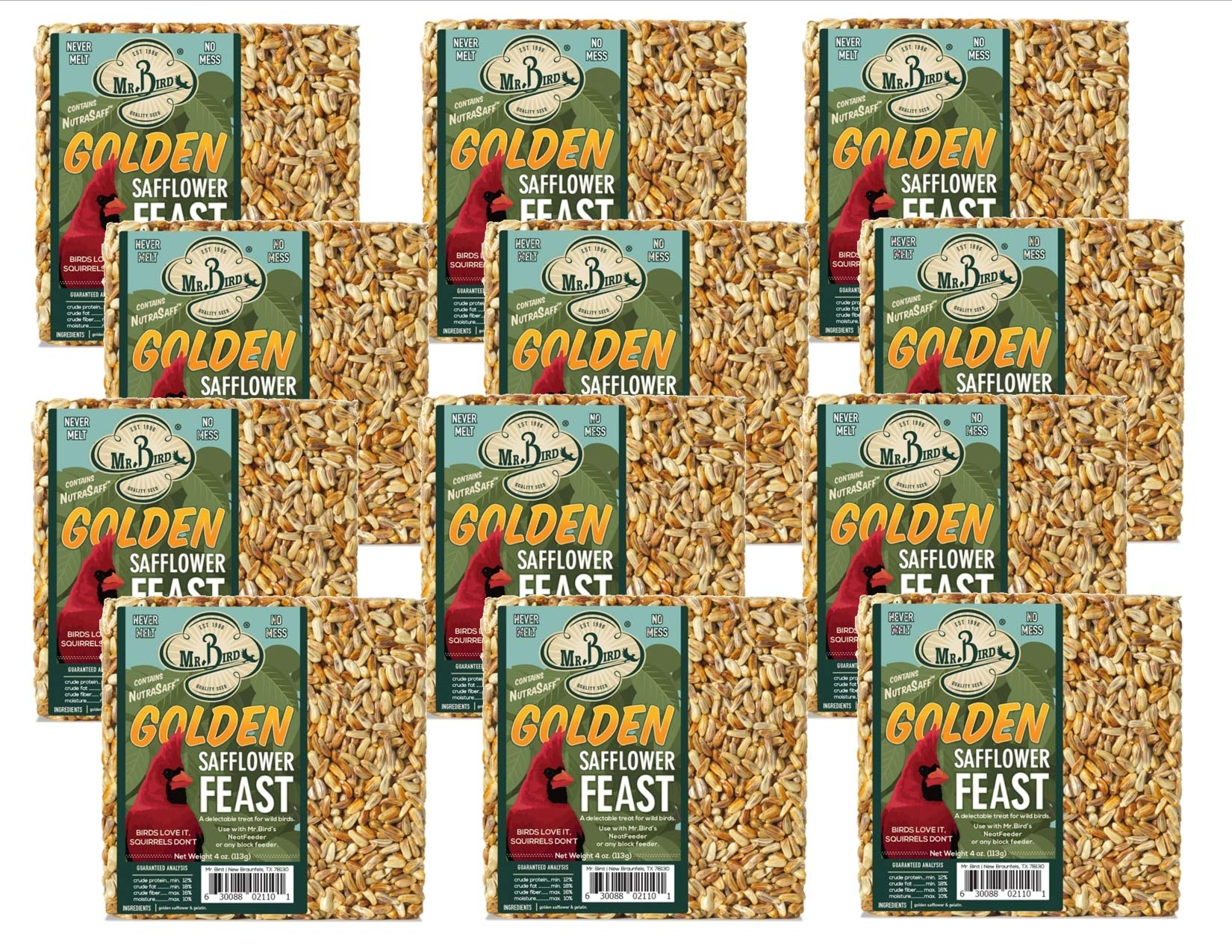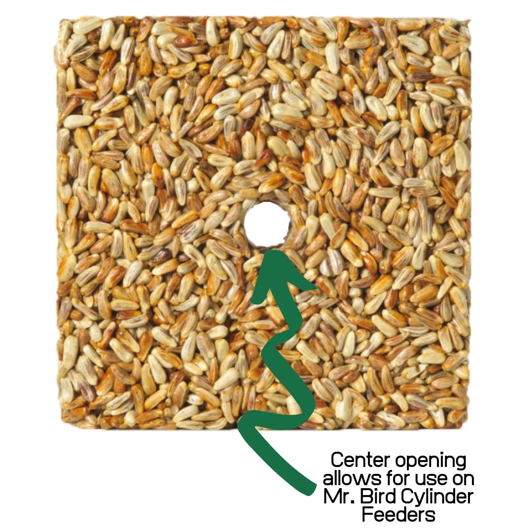 4 oz. Golden Safflower Seed Cakes! This 100% seed block is excellent for areas overwhelmed with squirrels, as squirrels generally don't like the bitter taste of safflower. These blocks are preferred by cardinals, grosbeaks and more, where grackles, sparrows and starlings generally don't safflower. The golden safflower seed is softer than traditional safflower, so will attract a great number of birds. Golden Safflower is different than your normal safflower seed because it's higher in oil content, higher in protein, and higher in fat - Making it more desirable to birds! This Mr. Bird cylinder will perform best when kept dry. Attracts birds much more quickly than suet and without the problem of melting in the summer heat. The convenient center hole allows for this seed cake to be mounted to a Mr. Bird cylinder feeder. Great for year-round bird feeding.